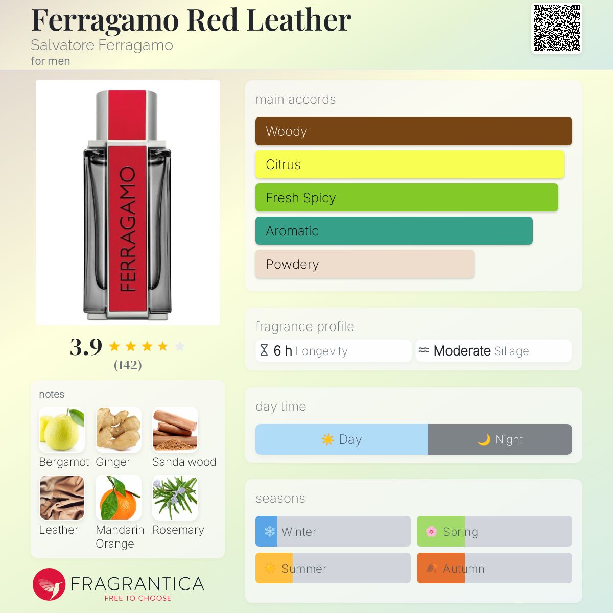 Ferragamo Red Leather by Salvatore Ferragamo is a Leather fragrance for men. This is a new fragrance. Ferragamo Red Leather was launched in 2024. Top notes are Bergamot, Ginger, and Mandarin Orange; middle notes are Rosemary, Orris, and Jasmine; base notes are Leather, Sandalwood,, and Vetiver. (Fragrantica.com)