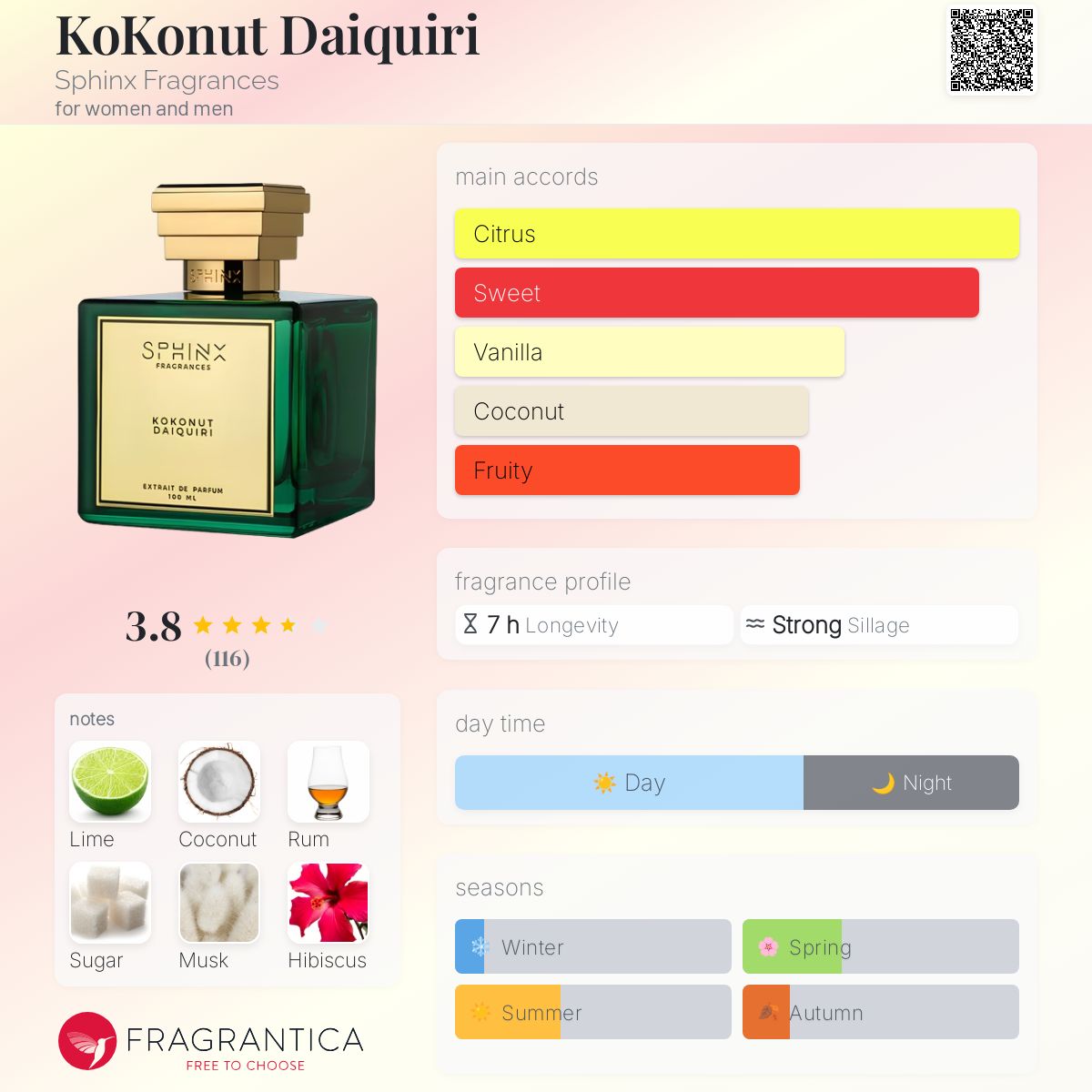 KoKonut Daiquiri by Sphinx Fragrances is a fragrance for women and men. This is a new fragrance. KoKonut Daiquiri was launched in 2023. Top notes are Lime, Coconut, Mandarin Orange, Bergamot and Orange; middle notes are Hibiscus, Fruits, Ylang-Ylang, Apple and Jasmine; base notes are Rum, Sugar, Musk, Vanilla and Amber. (Fragrantica.com)