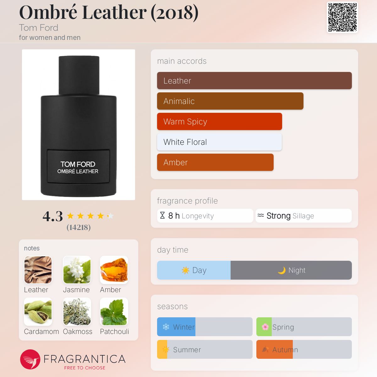 Ombré Leather (2018) by Tom Ford is a Leather fragrance for women and men. The nose behind this fragrance is Sonia Constant. Top note is Cardamom; middle notes are Leather and Jasmine Sambac; base notes are Amber, Moss and Patchouli. (Fragrantica.com)