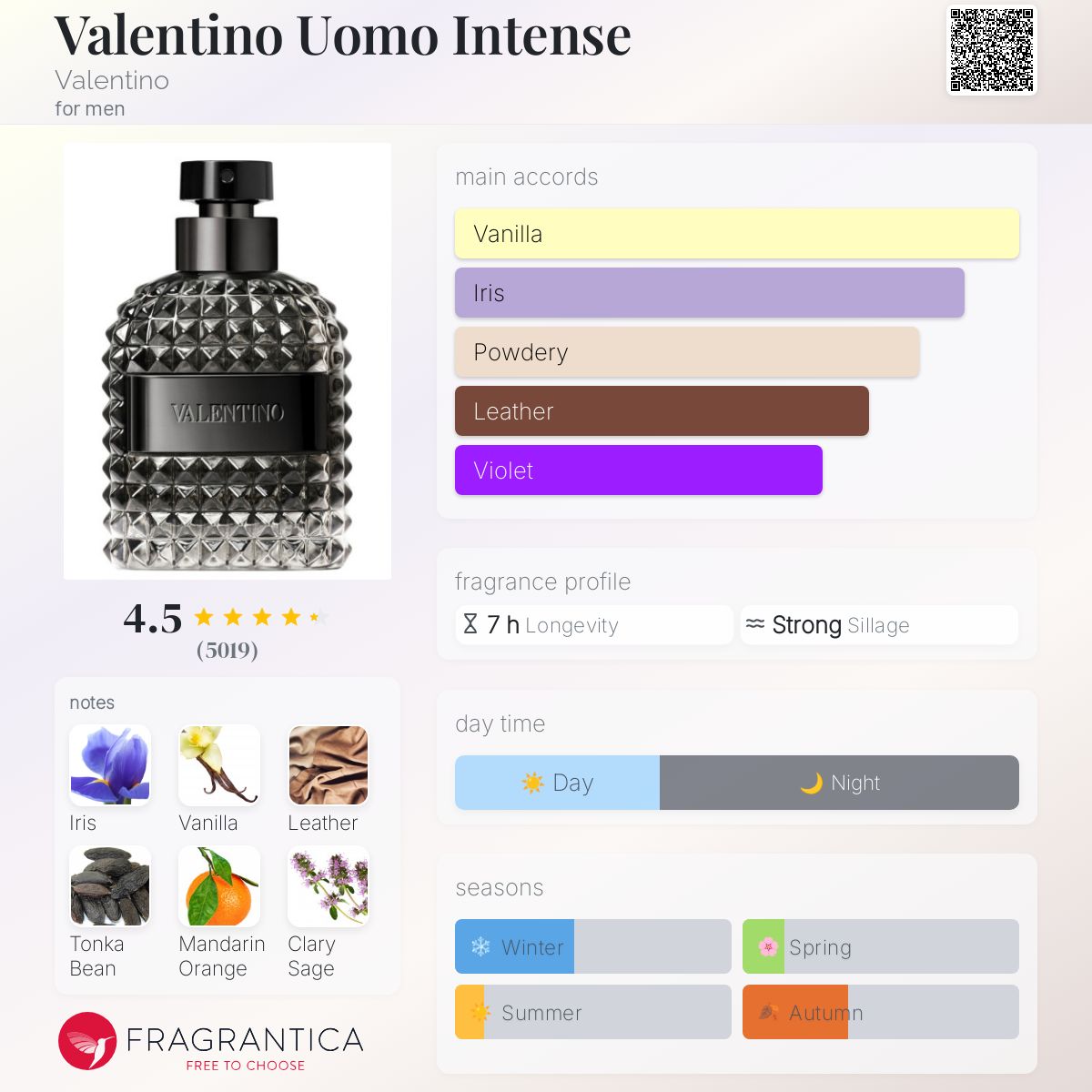 Valentino Uomo Intense by Valentino is a Leather fragrance for men. Valentino Uomo Intense was launched in 2016. Top notes are Mandarin Orange and Clary Sage; middle notes are Iris and Tonka Bean; base notes are Vanilla and Leather. (Fragrantica.com)