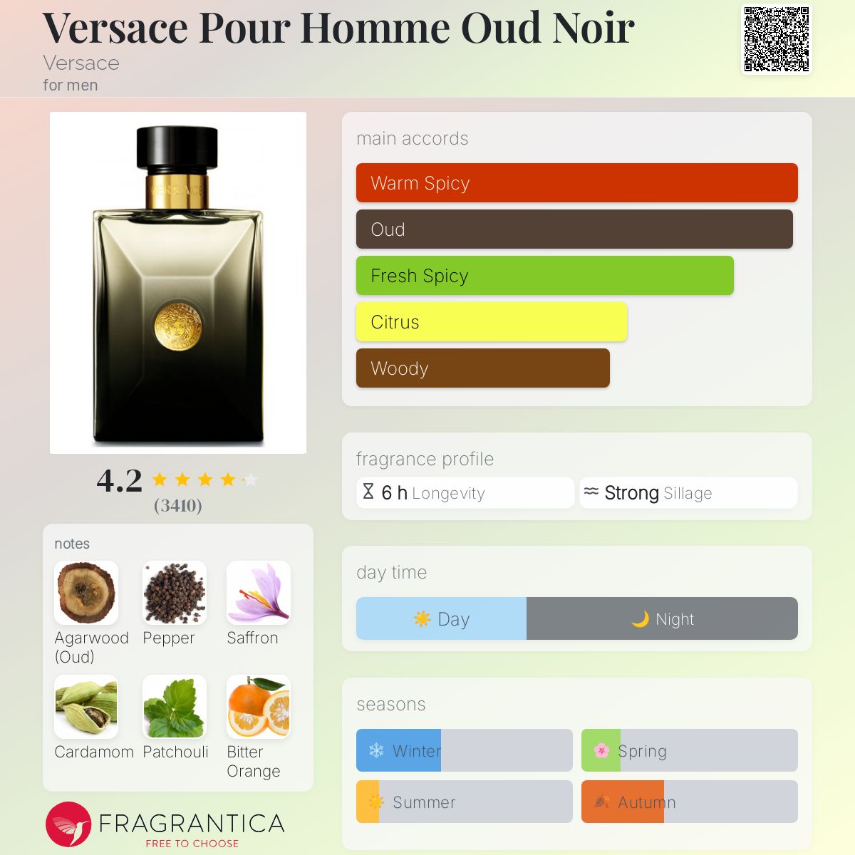 Versace Pour Homme Oud Noir by Versace is an Oriental Woody fragrance for men. Versace Pour Homme Oud Noir was launched in 2013. Top notes are Black Pepper, Bitter Orange, and Neroli; middle notes are Saffron, Cardamom, and Olibanum; base notes are Agarwood (Oud), Patchouli,, and Leatherwood. (Fragrantica.com)